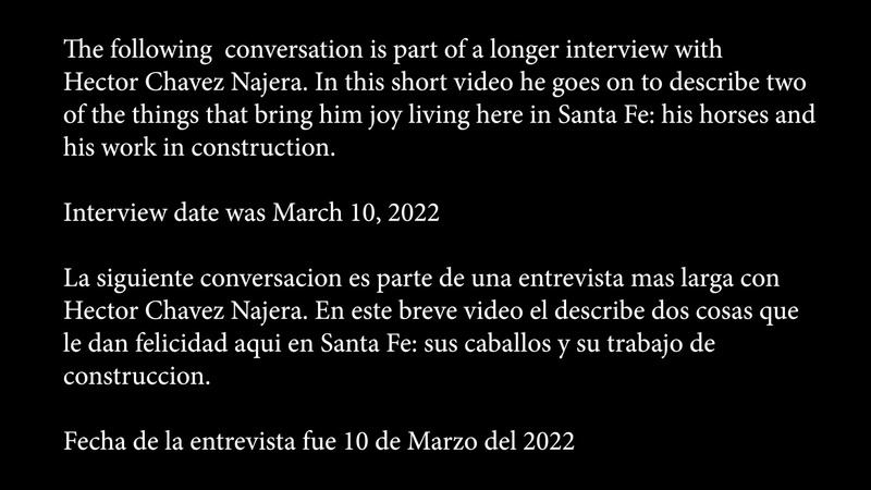 Hector Chavez Najera gives an oral history about training horses and working in construction in Santa Fe and the connection to Mexico. The audio was recorded at his home and the filming took place in La Cienega and Rancho Viejo during a remodel while he was working on site.